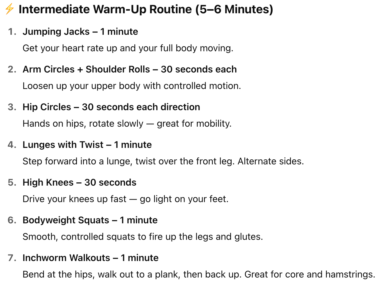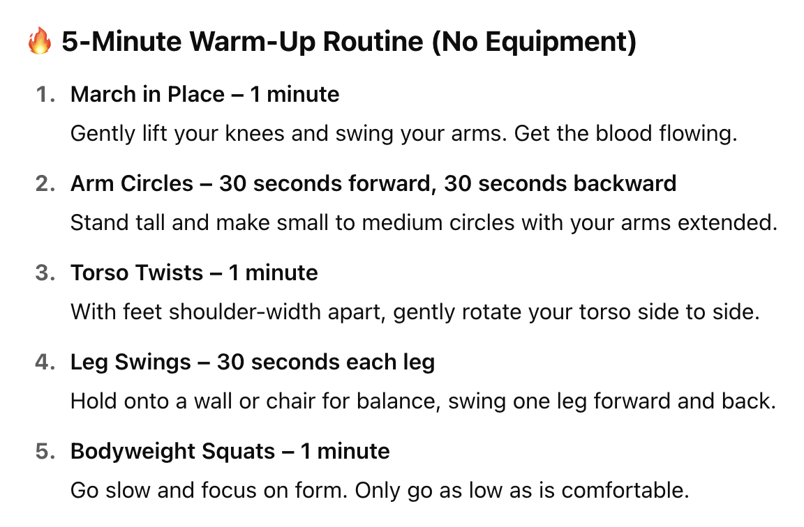 Warming up gets your body ready to move. It helps increase blood flow, loosen your muscles, and lower your risk of injury. Just a few minutes of light movement before your workout can help you feel better and move more safely.